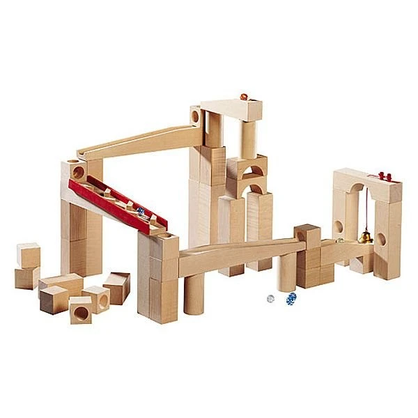 Bausatz mit 42 massiven Buchenholzteilen. Mit 6 Glasmurmeln und Glöckchen im Zieleinlauf. Mit anderen Haba Kugelbahnsets und Bausteinen verbaubar. Im Karton verpackt. Besonders gut geeignet in Kombination mit der Bausteinbank (3549), bitte gesondert bestellen.